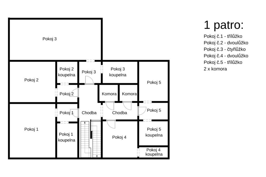 • 1. patro: 2× třílůžkový, 2× dvoulůžkový a 1× čtyřlůžkový pokoj