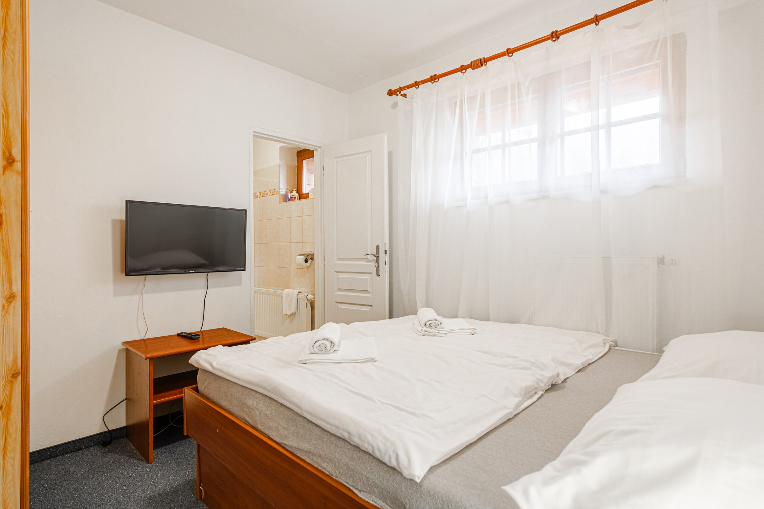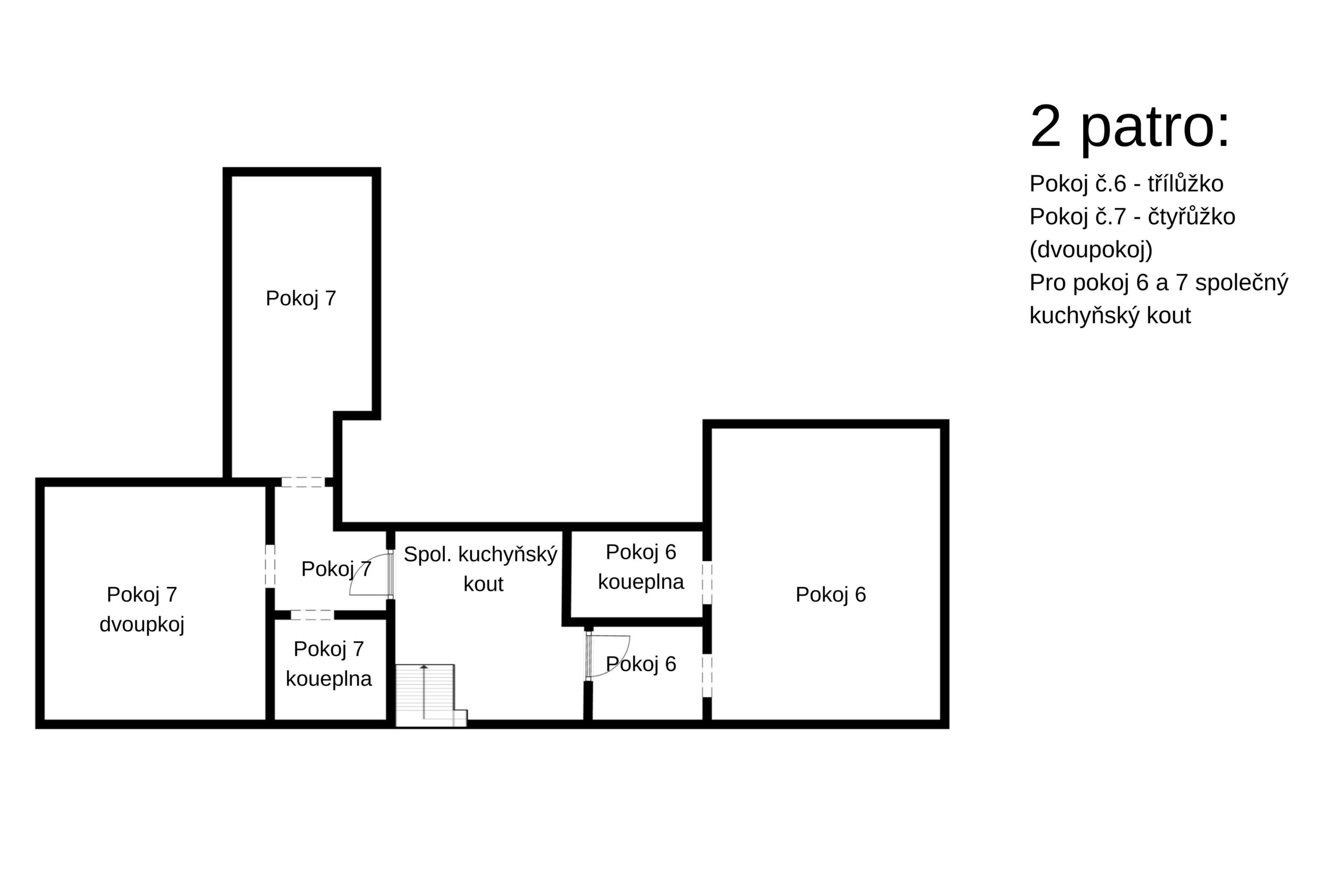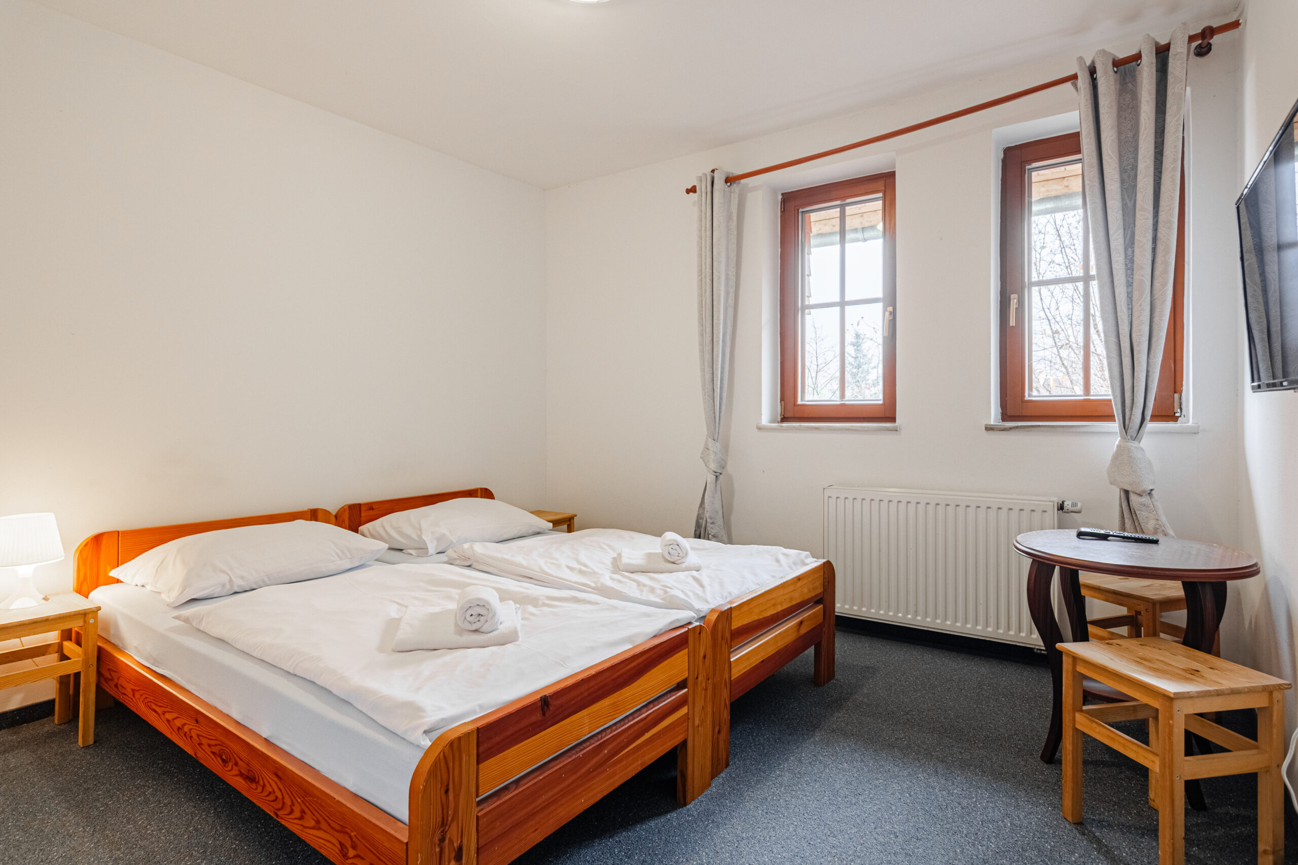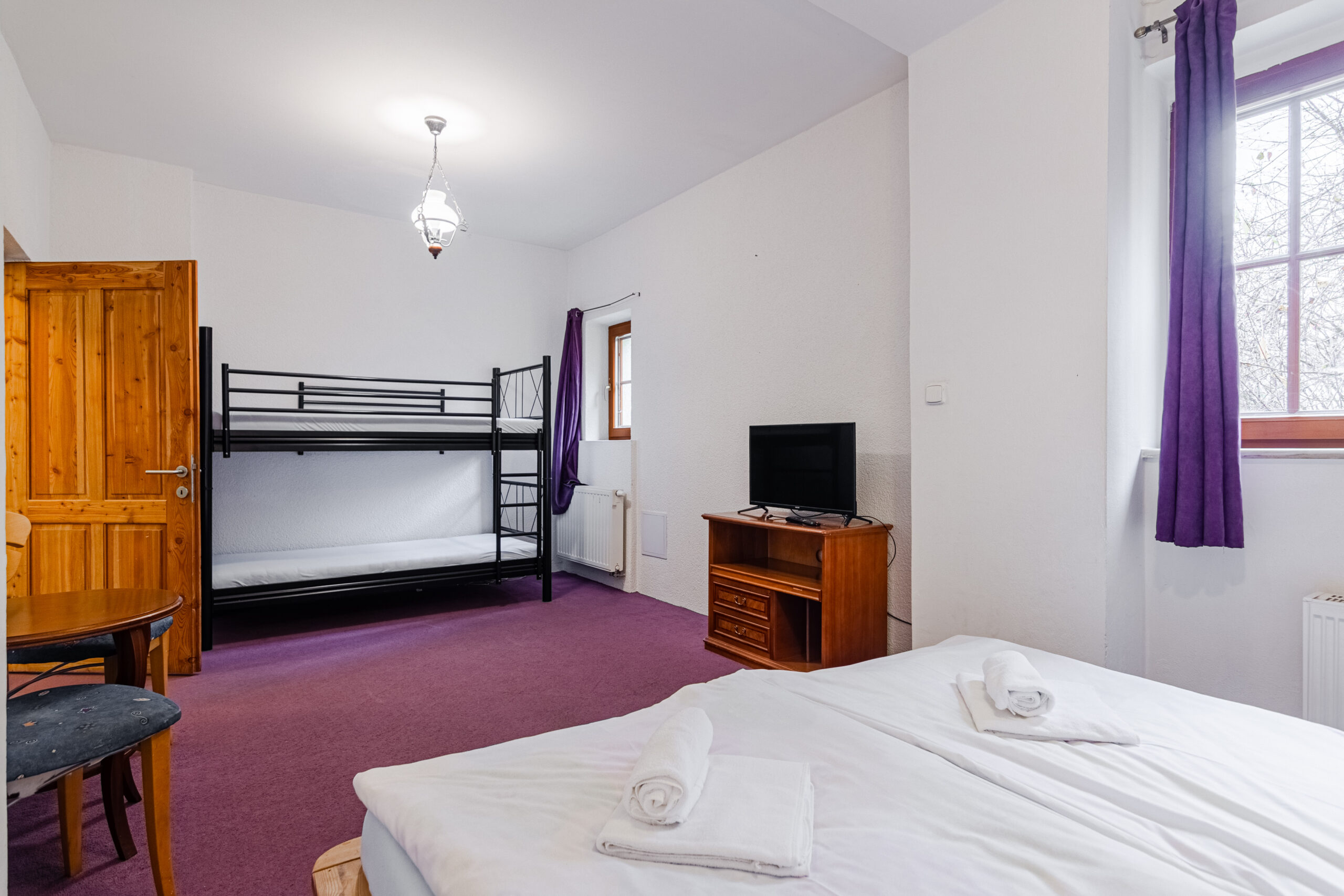 • 2. patro: 1× třílůžkový pokoj a 1× čtyřlůžkový apartmán se dvěma samostatnými ložnicemi
